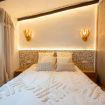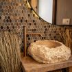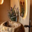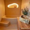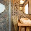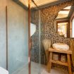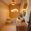 El baño principal, de inspiración orgánica, con una ducha de obra, lavamanos de piedra y una iluminación cálida y sutil.