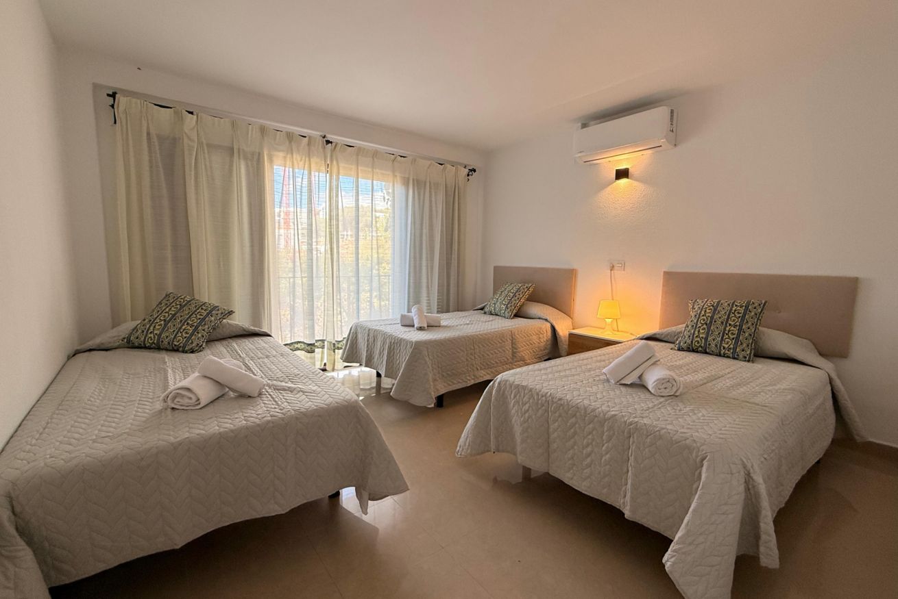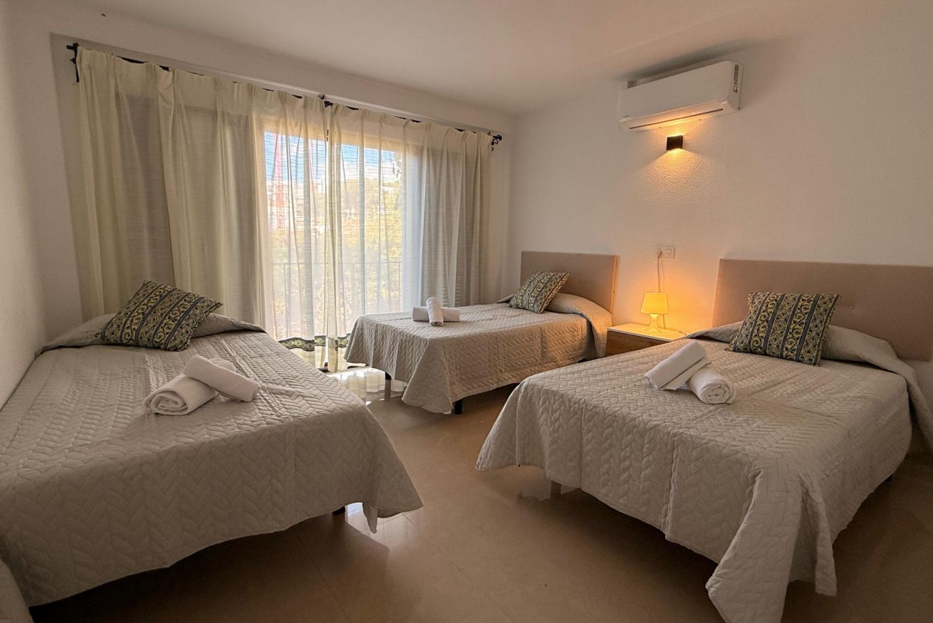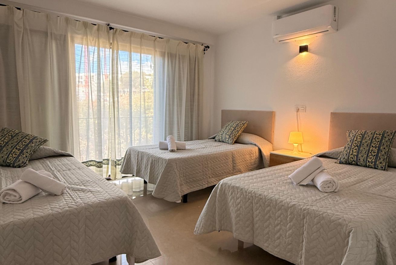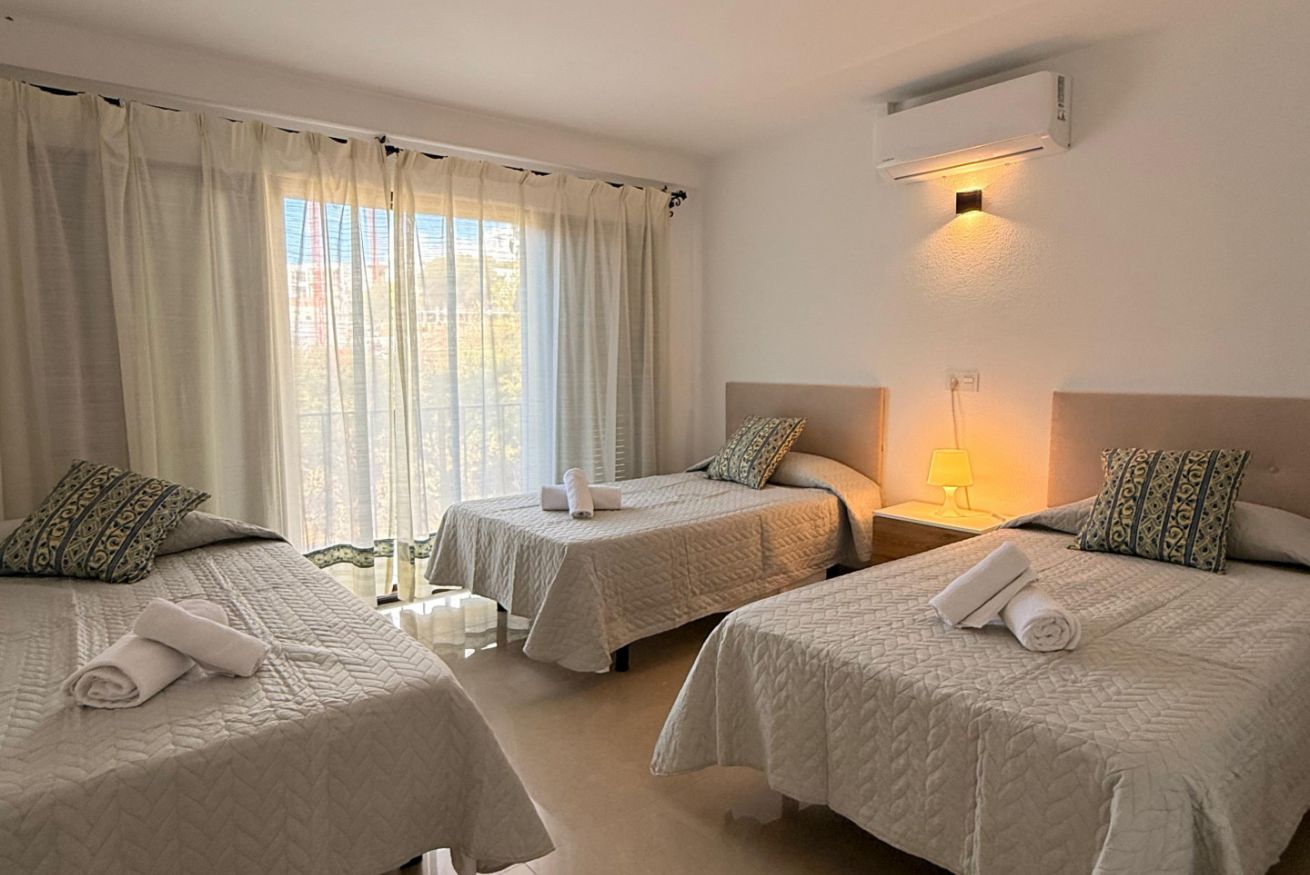 En la planta alta se encuentran las dos habitaciones y un aseo adicional. El dormitorio principal es amplio, muy luminoso y cuenta con aire acondicionado. El segundo dormitorio dispone de tres camas individuales, también con aire acondicionado, un gran ventanal que aporta abundante luz natural y salida a un balcón privado con juego de sillas exterior, perfecto para disfrutar de la brisa marina.