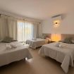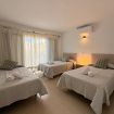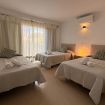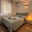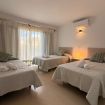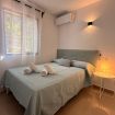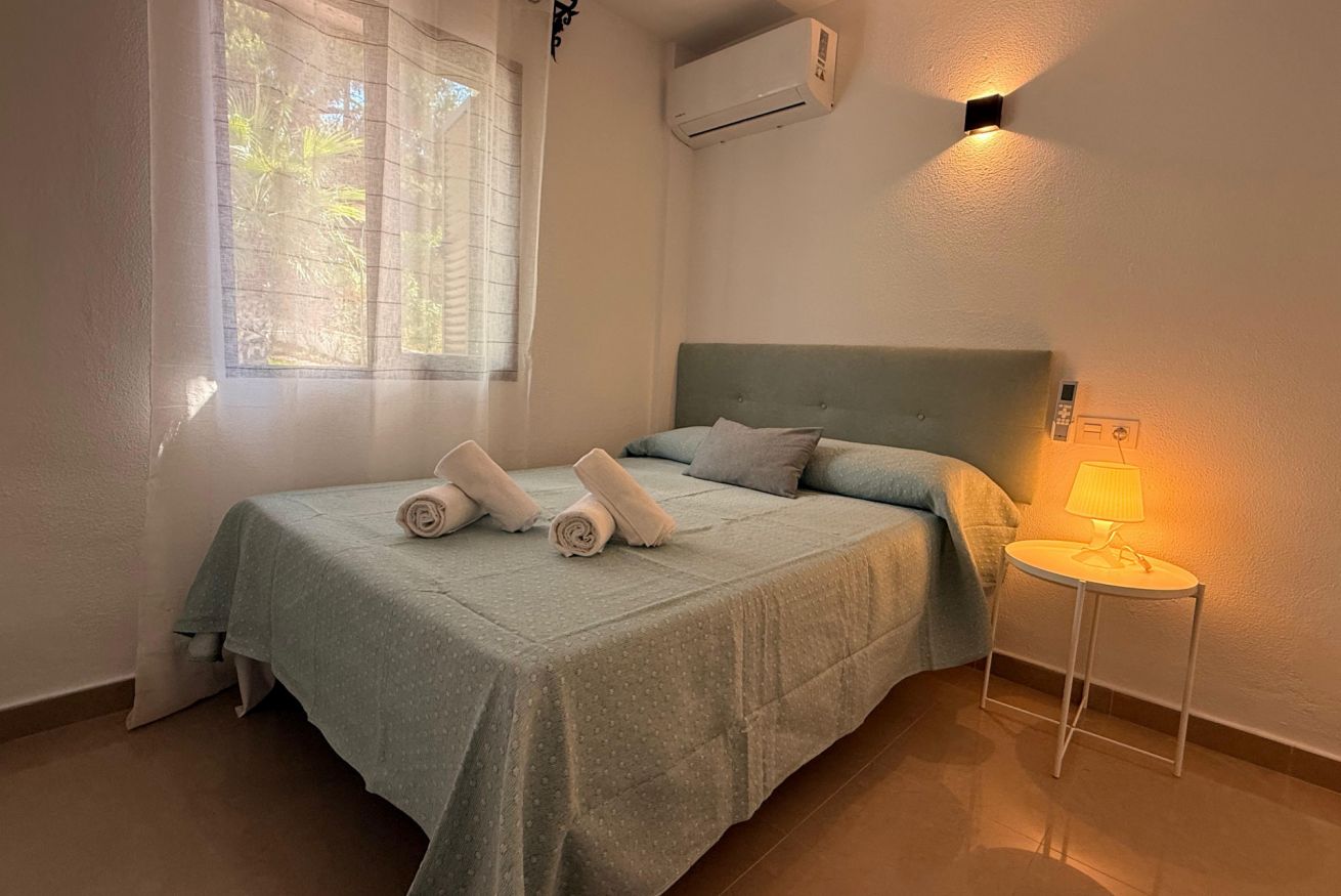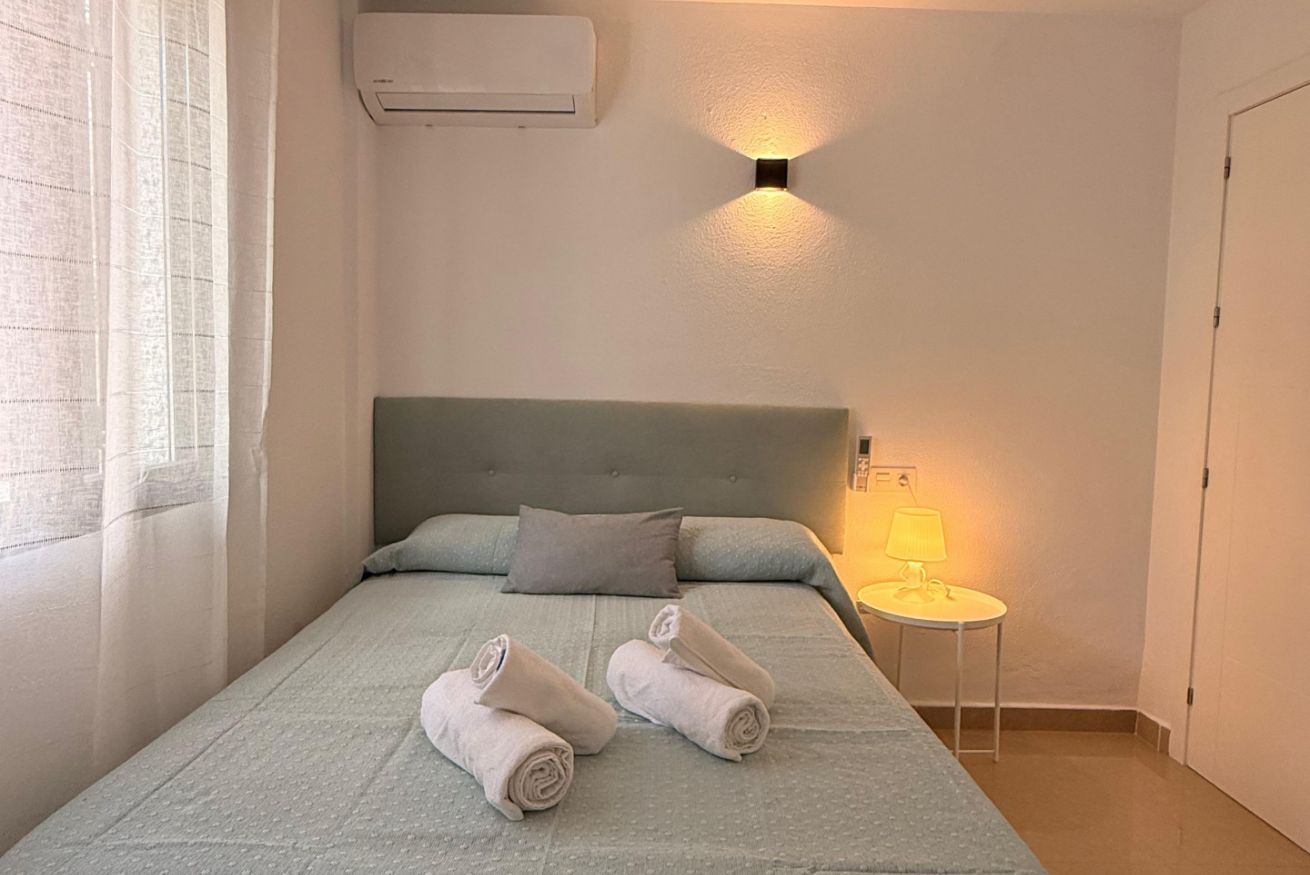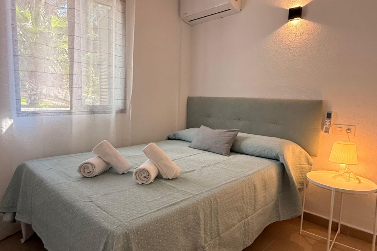 En la planta alta se encuentran las dos habitaciones y un aseo adicional. El dormitorio principal es amplio, muy luminoso y cuenta con aire acondicionado. El segundo dormitorio dispone de tres camas individuales, también con aire acondicionado, un gran ventanal que aporta abundante luz natural y salida a un balcón privado con juego de sillas exterior, perfecto para disfrutar de la brisa marina.