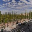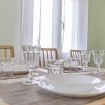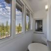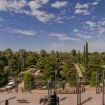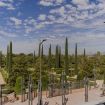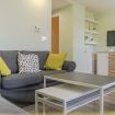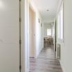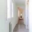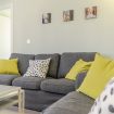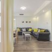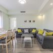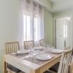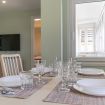 La zona de estar destaca por su amplitud y luminosidad, con un salón decorado en estilo minimalista, dos sofás grandes, cojines coloridos y una mesa de centro funcional. El comedor, integrado al salón, dispone de una mesa con sillas, ideal para compartir comidas y momentos en grupo. La luz natural inunda todo el espacio a través de amplios ventanales con vistas directas al parque.